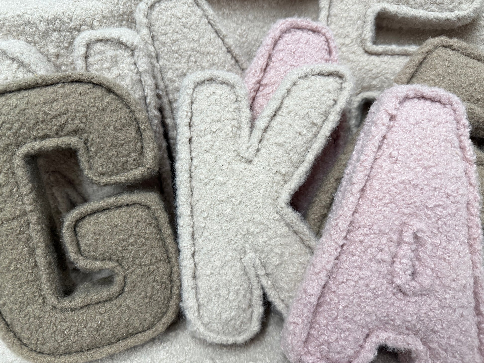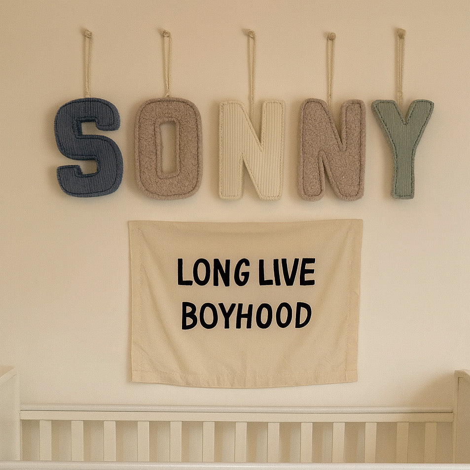 Soft, textured bouclé fabric letters designed to add a calm, cosy feel to a nursery or child’s bedroom.