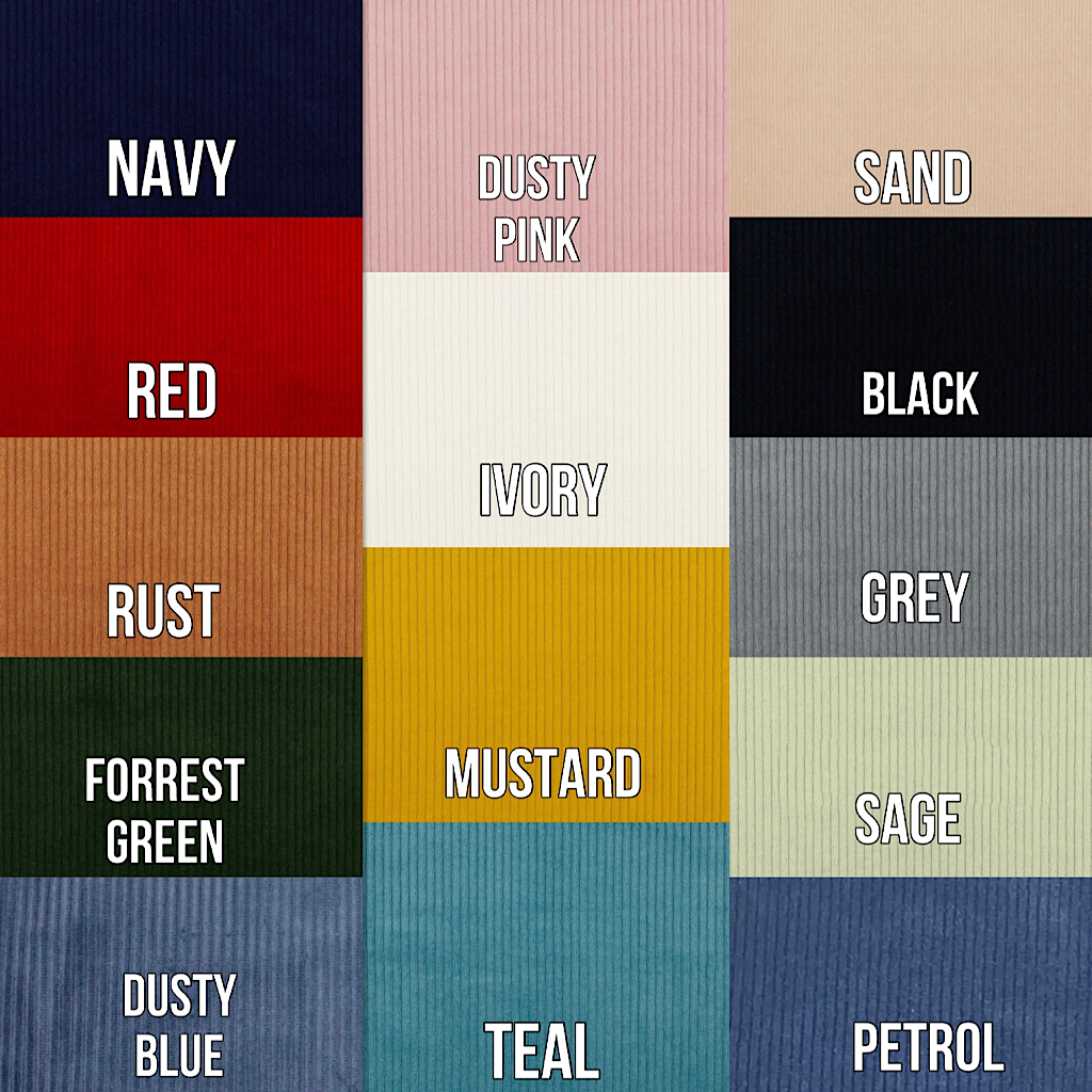 handmade to order in luxury corduroy fabric in your choice of 14 colours - dusty pink, dusty blue, mustard, rust, teal, petrol, sage, sand, black, navy, red, forrest green, ivory, grey