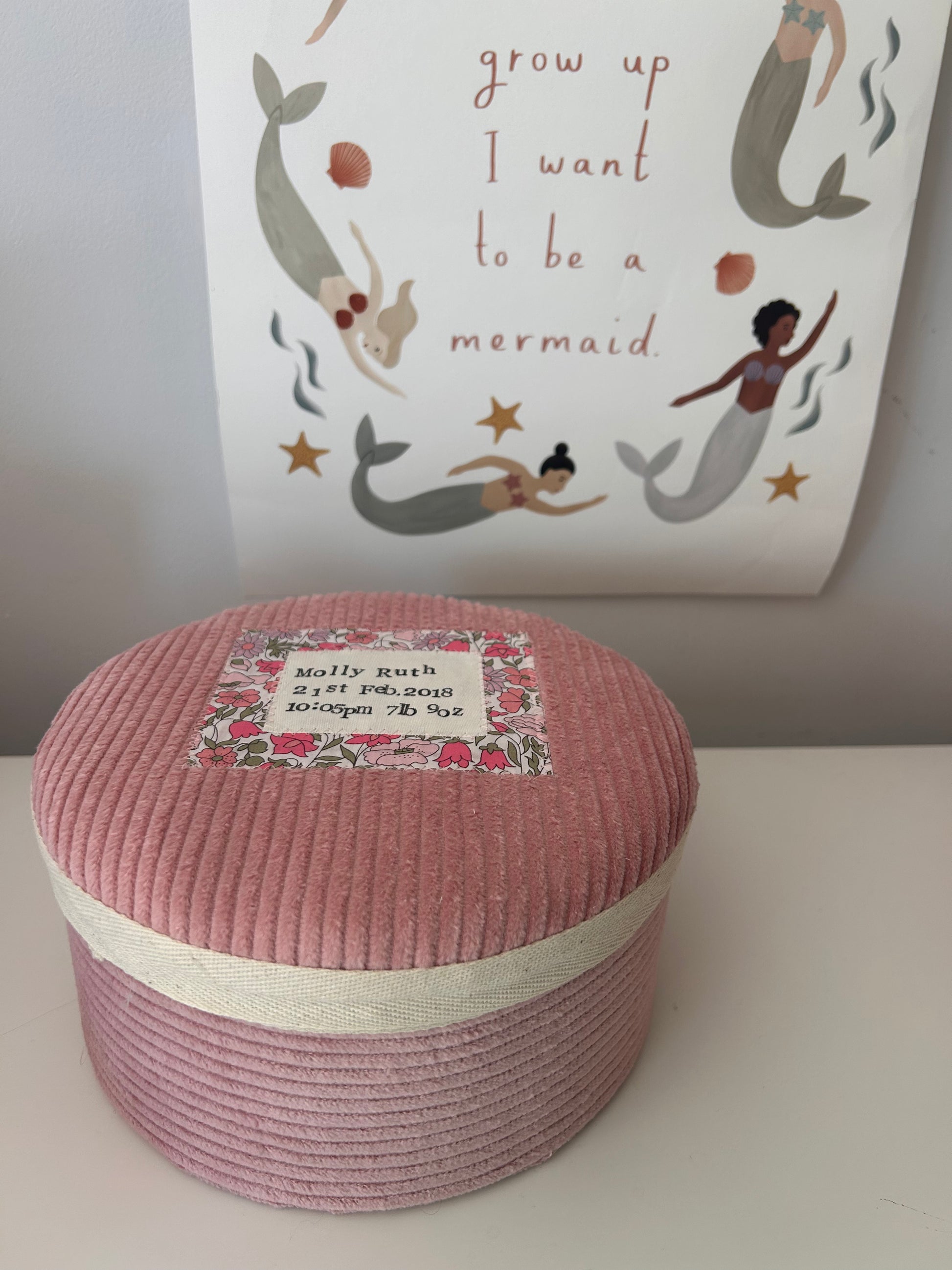 Handmade round fabric memory boxes. Personalised with Liberty London fabric.