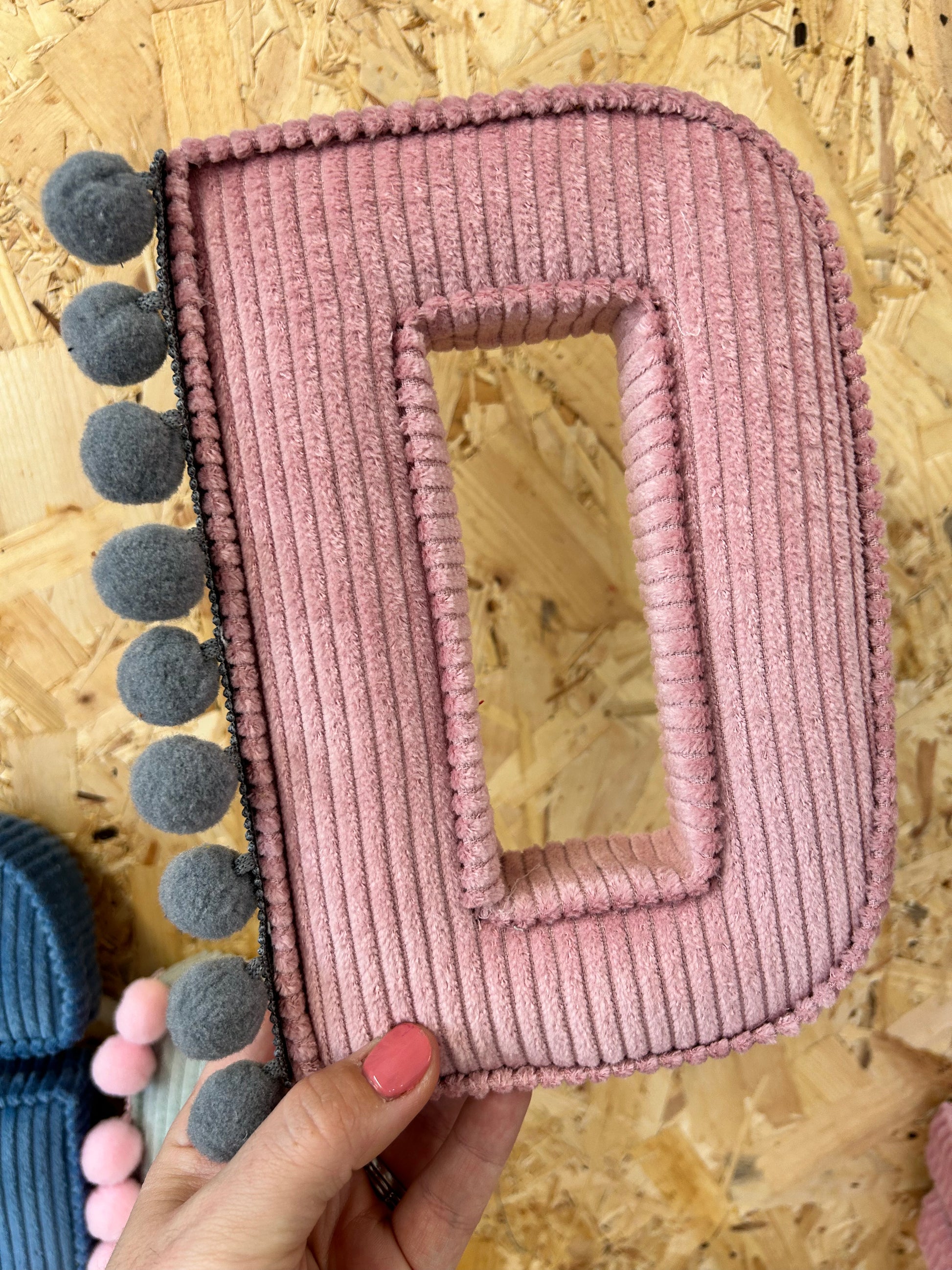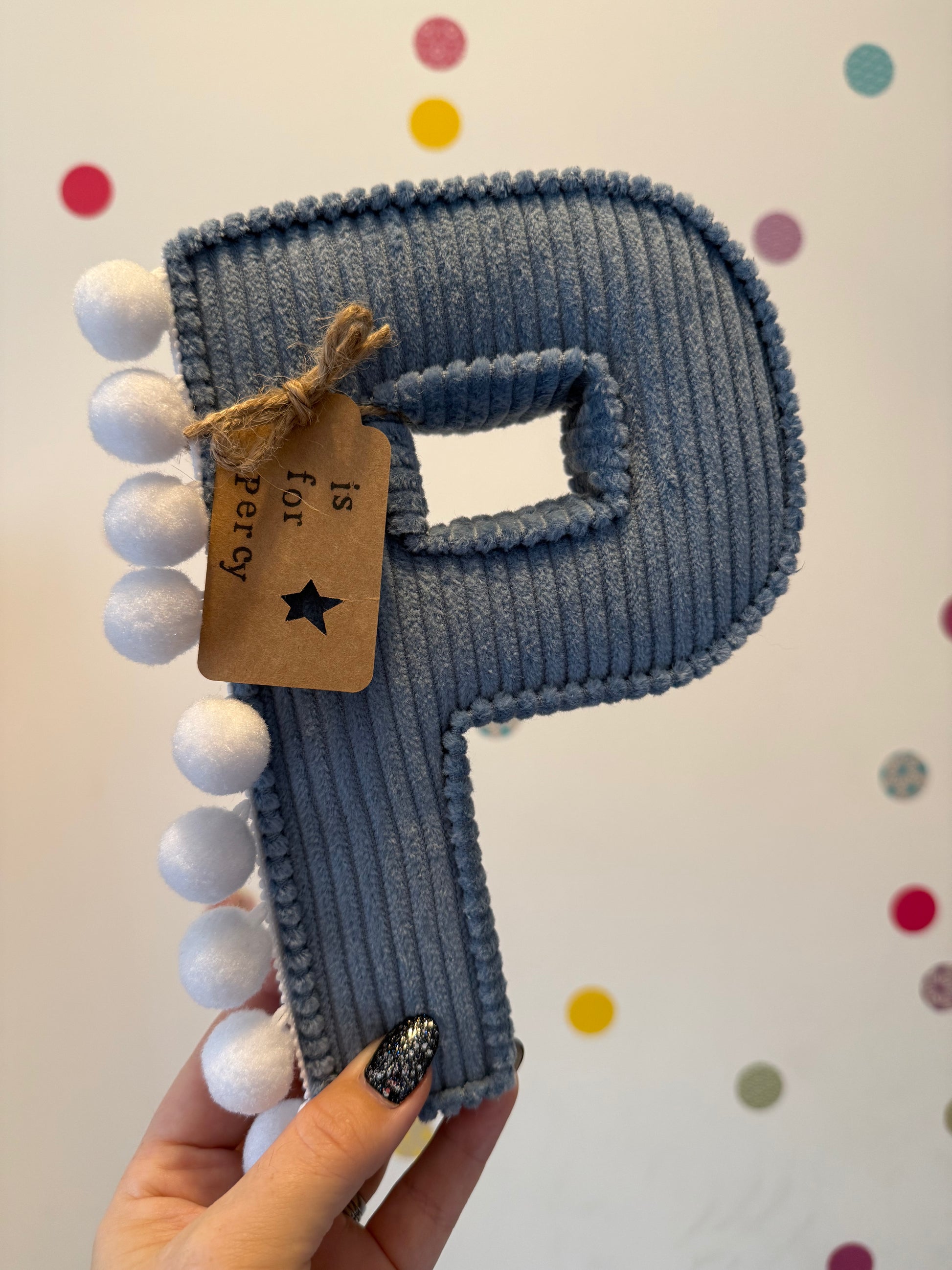 Handmade personalised fabric letters created using soft ribbed corduroy and finished with a delicate pompom trim.