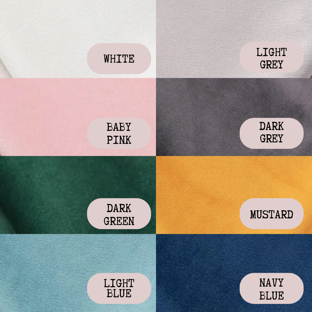 Available in white, baby pink, light grey, dark grey, baby blue, navy and mustard.